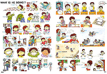 Listen to my story and find the pictures. @He hears the alarm clock go off. He gets up, and is now trying to put on his sweater. Now he is taking it off. You kow why? He put it on inside out. So he tries all over again. What color is his sweater? It's green. Good. (Word Book CD TRACK 29 「短いお話 No.2」)
