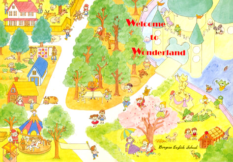 この絵の中に、子どもが親しんでいる 物語や歌に出てくる人物や動物が どれだけいるでしょうか。 Can you see Kintaro? Can you see Hanasaka-jiisan? What is the name of Hanasaka-jiisan's dog? I can see Otohimesama. Where is she? Touch the caw. It's Jack's caw. Do you know the story of ジャックと豆の木? Touch the peach. Momotaro is in the peach. 等言いながら、子どもたちと絵をよく眺めて ください。 |